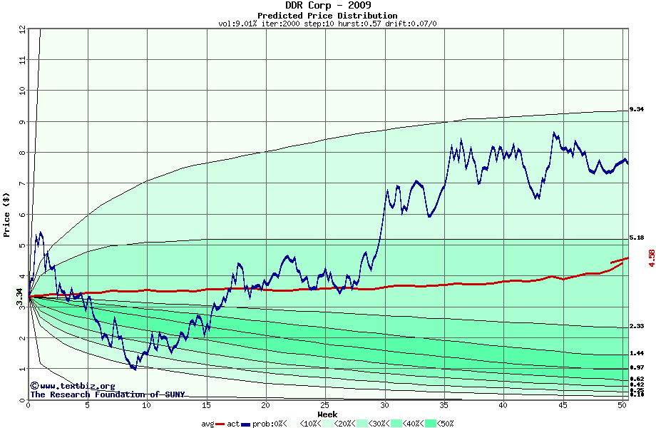 The high to date and low to date prices of the stock plotted against a random walk model for 2009 (what's this?).