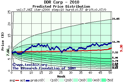 The high to date and low to date prices of the stock plotted against a random walk model for 2010 (what's this?).