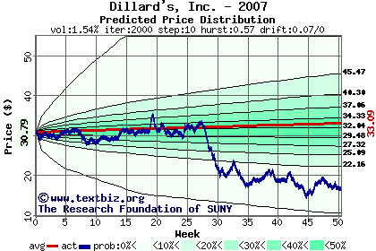 The following graph plots the year-to-date performance of the stock for 2007 compared to the probability calculated by a random walk model.