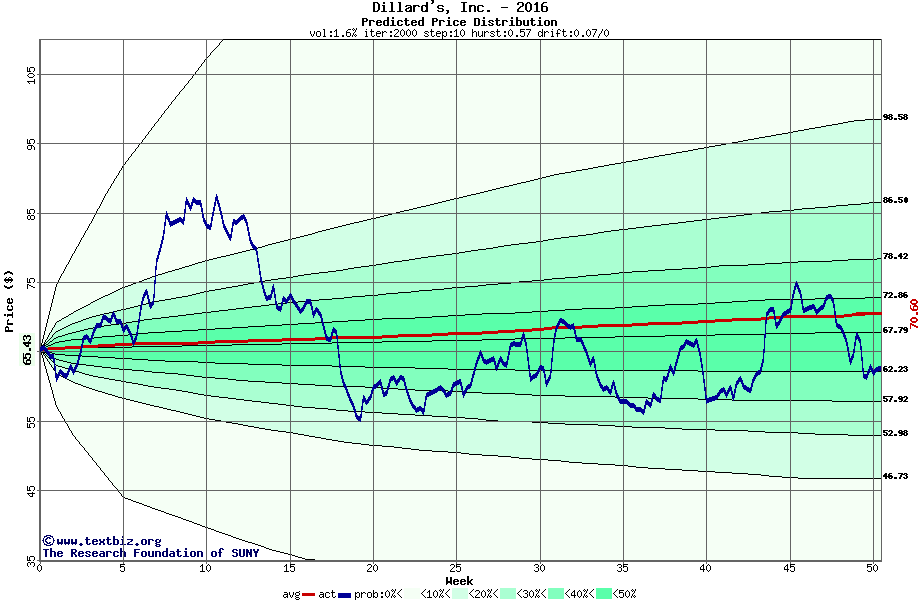 The following graph plots the year-to-date performance of the stock for 2016 compared to the probability calculated by a random walk model.