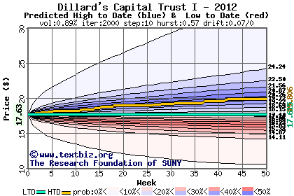 The high to date and low to date prices of the stock plotted against a random walk model for 2012 (what's this?).