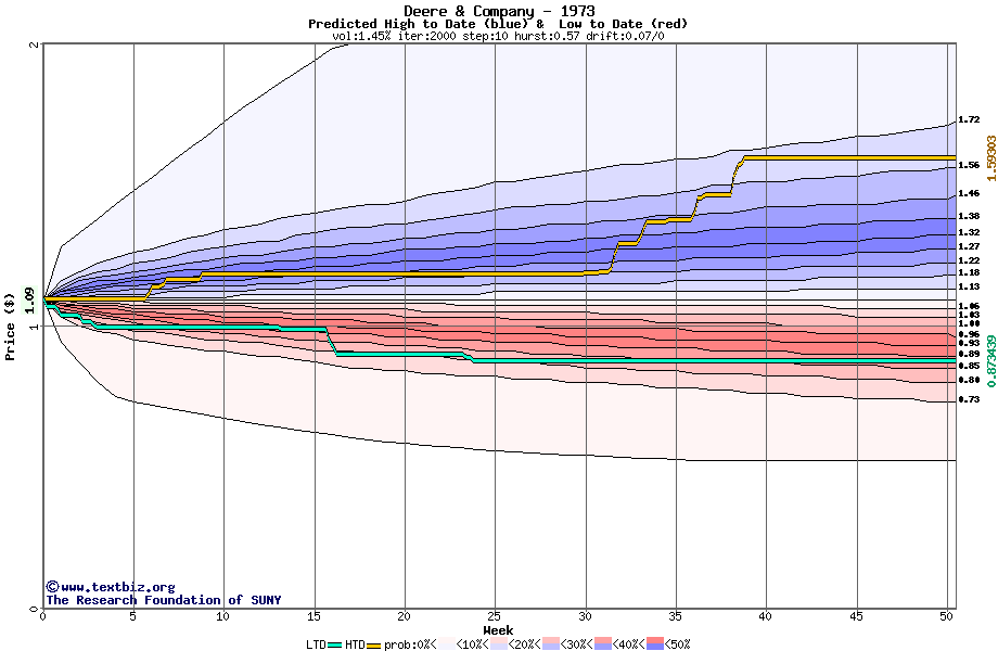 The high to date and low to date prices of the stock plotted against a random walk model for 1973 (what's this?).