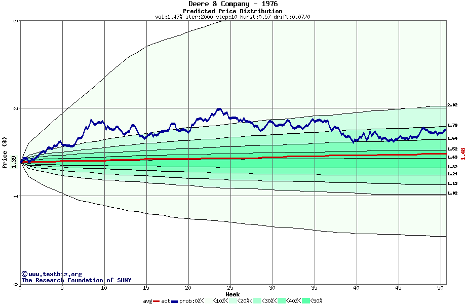 The following graph plots the year-to-date performance of the stock for 1976 compared to the probability calculated by a random walk model.