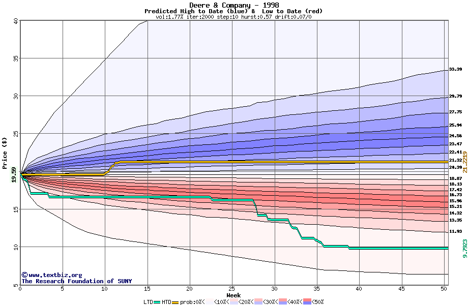 The high to date and low to date prices of the stock plotted against a random walk model for 1998 (what's this?).