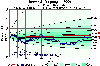 The high to date and low to date prices of the stock plotted against a random walk model for 2000 (what's this?).