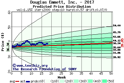The high to date and low to date prices of the stock plotted against a random walk model for 2017 (what's this?).
