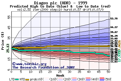 The high to date and low to date prices of the stock plotted against a random walk model for 1999 (what's this?).