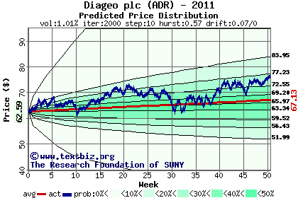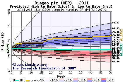 The high to date and low to date prices of the stock plotted against a random walk model for 2011 (what's this?).