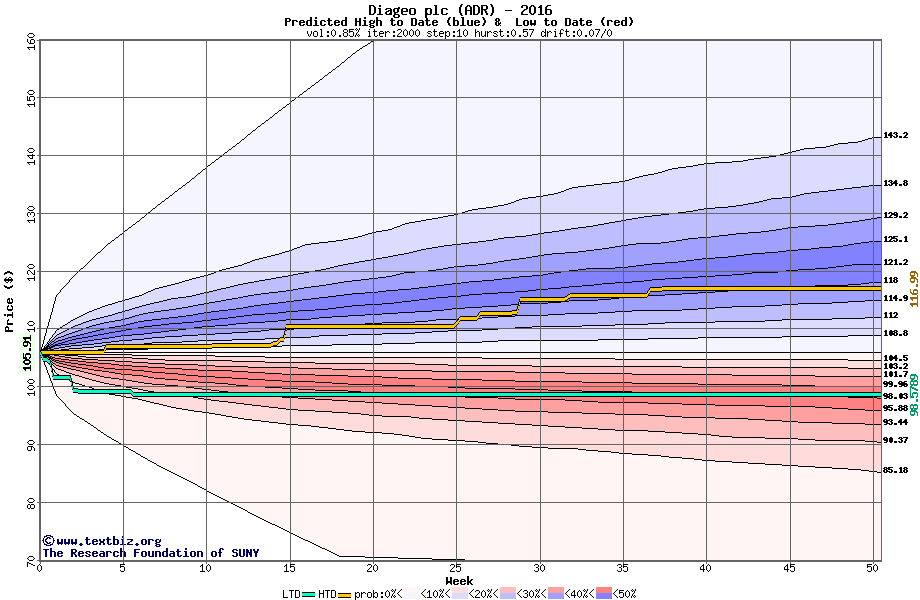 The high to date and low to date prices of the stock plotted against a random walk model for 2016 (what's this?).