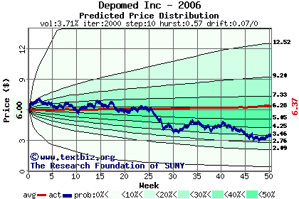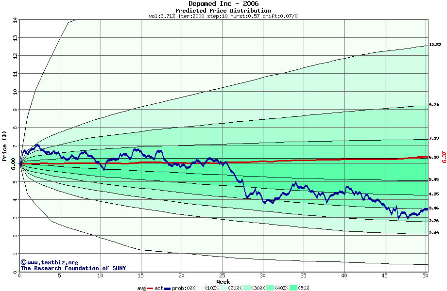 The following graph plots the year-to-date performance of the stock for 2006 compared to the probability calculated by a random walk model.