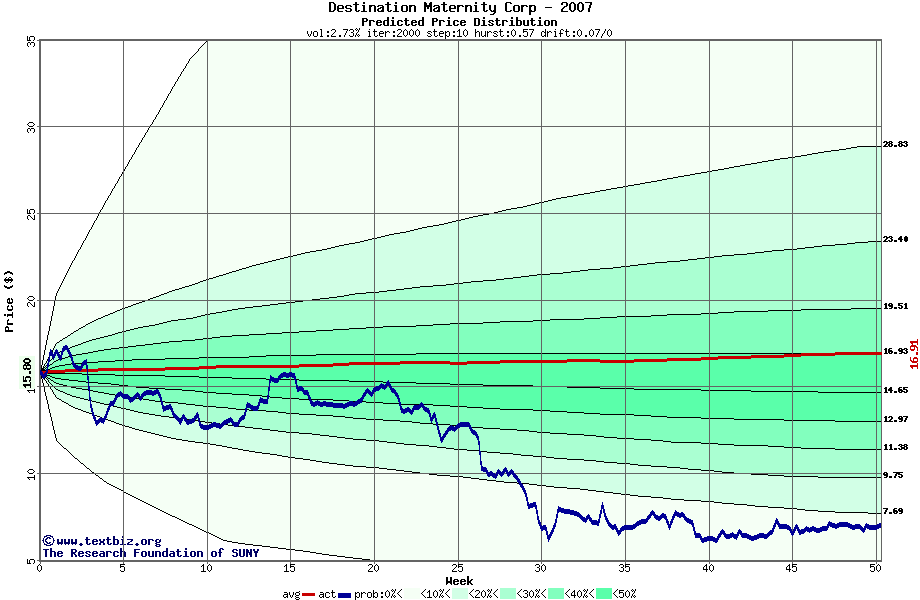 The following graph plots the year-to-date performance of the stock for 2007 compared to the probability calculated by a random walk model.