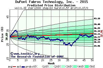 The high to date and low to date prices of the stock plotted against a random walk model for 2015 (what's this?).