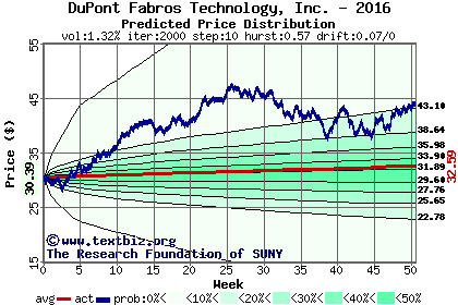 The high to date and low to date prices of the stock plotted against a random walk model for 2016 (what's this?).