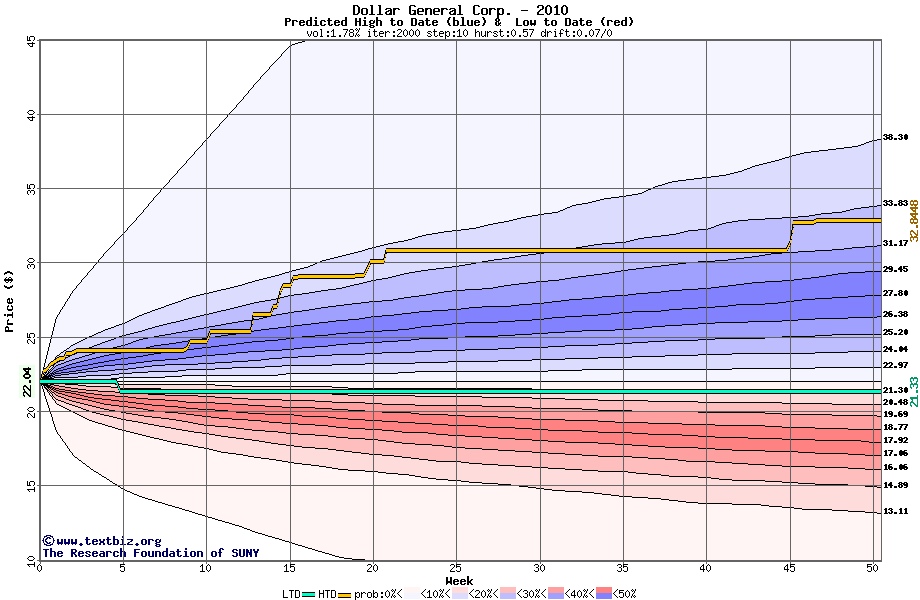 The high to date and low to date prices of the stock plotted against a random walk model for 2010 (what's this?).