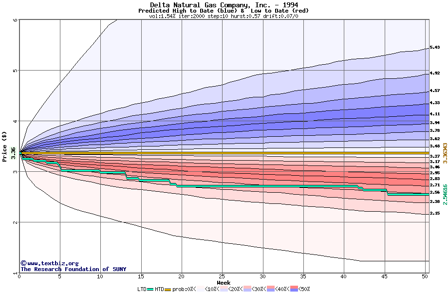 The high to date and low to date prices of the stock plotted against a random walk model for 1994 (what's this?).