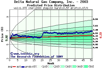 The high to date and low to date prices of the stock plotted against a random walk model for 2003 (what's this?).