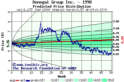 The high to date and low to date prices of the stock plotted against a random walk model for 1998 (what's this?).