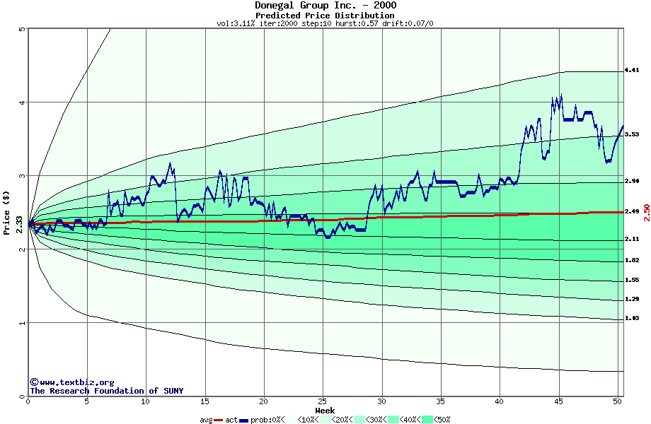 The high to date and low to date prices of the stock plotted against a random walk model for 2000 (what's this?).