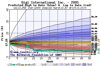 The high to date and low to date prices of the stock plotted against a random walk model for 2005 (what's this?).