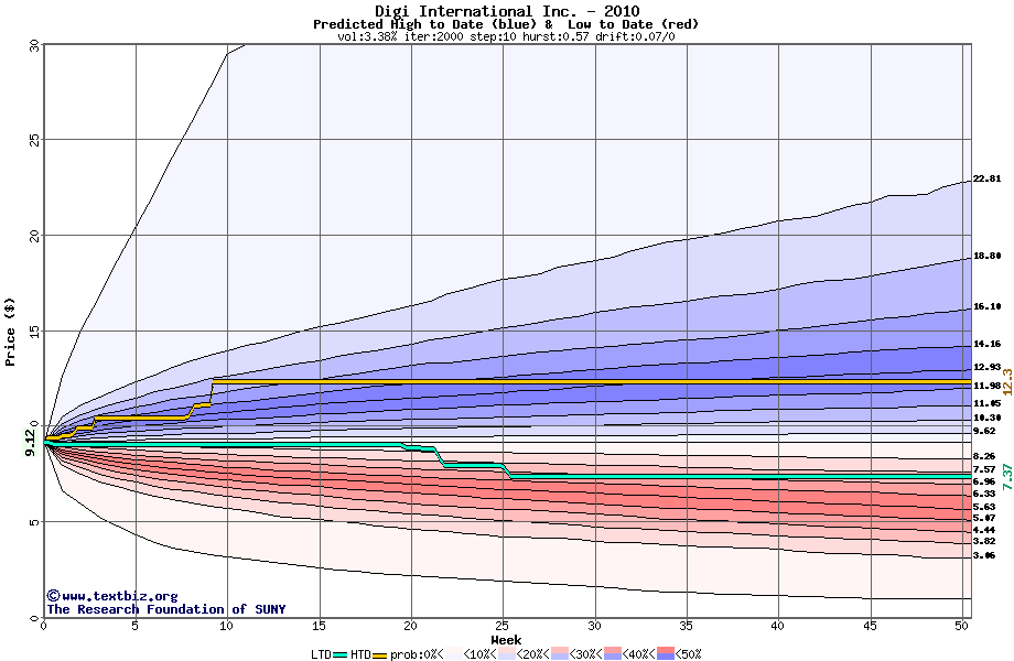 The high to date and low to date prices of the stock plotted against a random walk model for 2010 (what's this?).