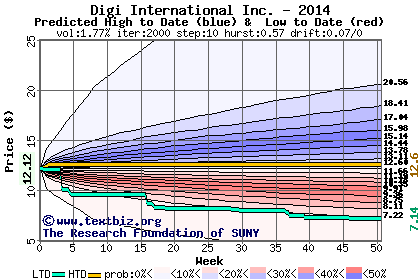 The high to date and low to date prices of the stock plotted against a random walk model for 2014 (what's this?).