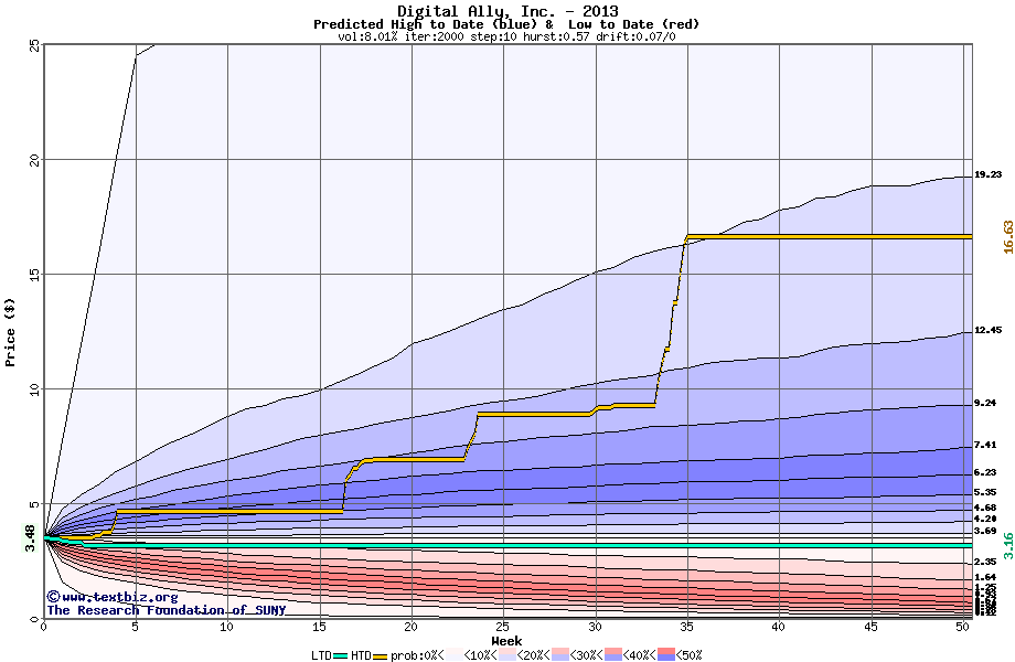 The high to date and low to date prices of the stock plotted against a random walk model for 2013 (what's this?).