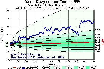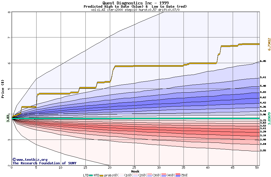 The high to date and low to date prices of the stock plotted against a random walk model for 1999 (what's this?).