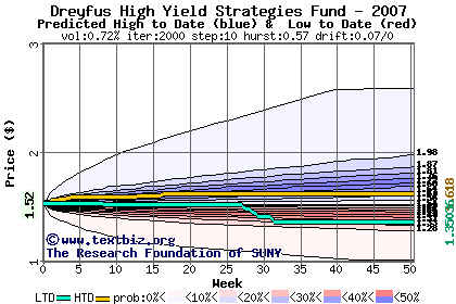 The high to date and low to date prices of the stock plotted against a random walk model for 2007 (what's this?).