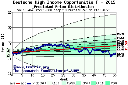 The high to date and low to date prices of the stock plotted against a random walk model for 2015 (what's this?).