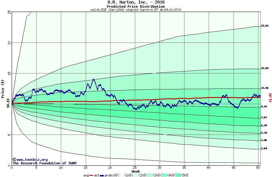 The high to date and low to date prices of the stock plotted against a random walk model for 2010 (what's this?).