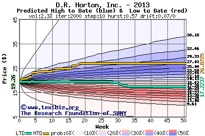 The high to date and low to date prices of the stock plotted against a random walk model for 2013 (what's this?).