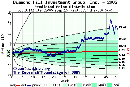 The following graph plots the year-to-date performance of the stock for 2005 compared to the probability calculated by a random walk model.