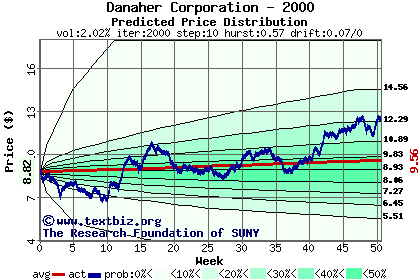 The high to date and low to date prices of the stock plotted against a random walk model for 2000 (what's this?).