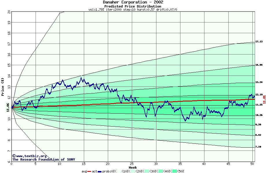 The following graph plots the year-to-date performance of the stock for 2002 compared to the probability calculated by a random walk model.