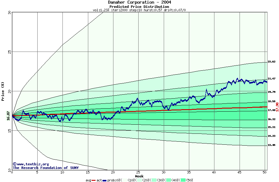 The following graph plots the year-to-date performance of the stock for 2004 compared to the probability calculated by a random walk model.