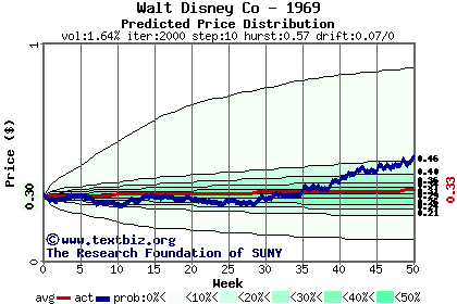The following graph plots the year-to-date performance of the stock for 1969 compared to the probability calculated by a random walk model.