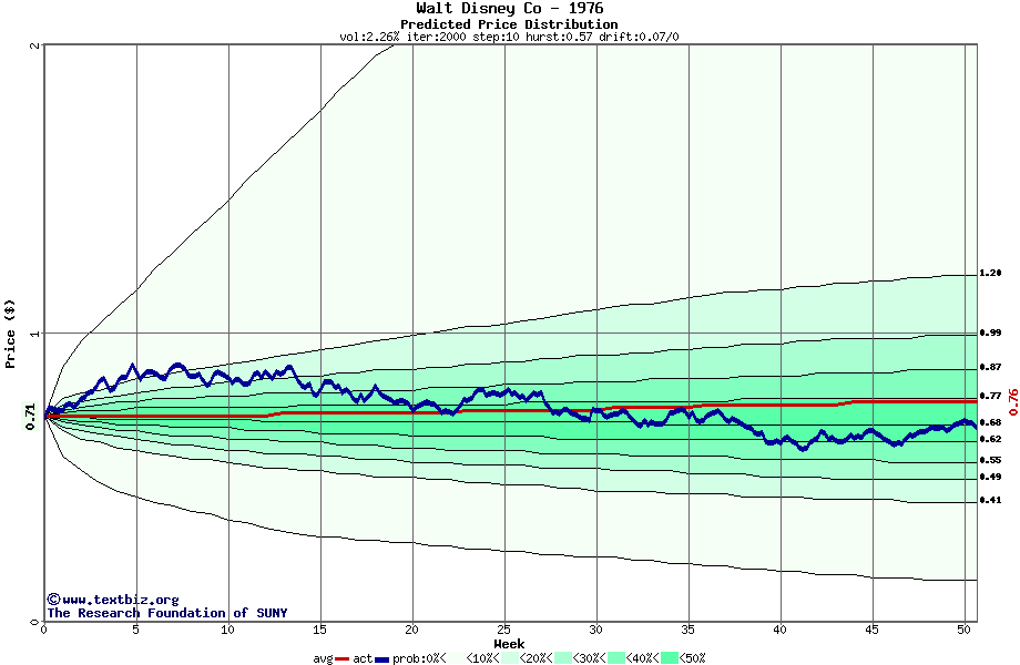 The following graph plots the year-to-date performance of the stock for 1976 compared to the probability calculated by a random walk model.
