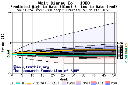 The high to date and low to date prices of the stock plotted against a random walk model for 1980 (what's this?).