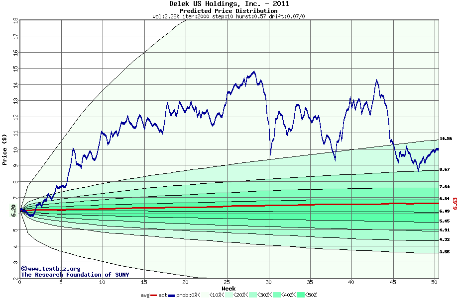 The high to date and low to date prices of the stock plotted against a random walk model for 2011 (what's this?).