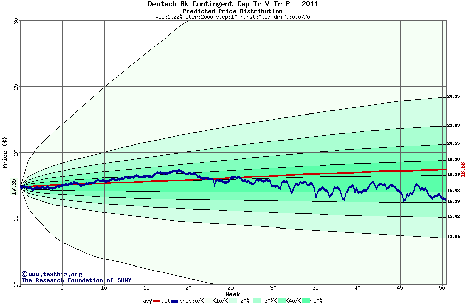 The following graph plots the year-to-date performance of the stock for 2011 compared to the probability calculated by a random walk model.