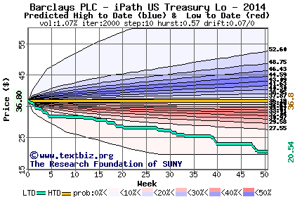 The following graph plots the year-to-date performance of the stock for 2014 compared to the probability calculated by a random walk model.