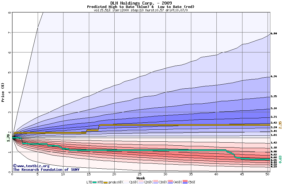 The high to date and low to date prices of the stock plotted against a random walk model for 2009 (what's this?).