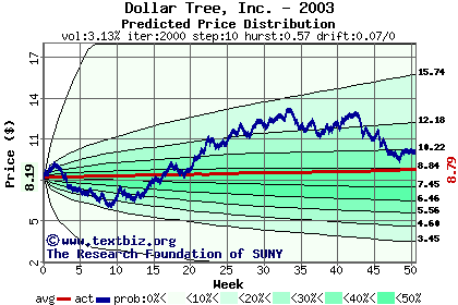 The high to date and low to date prices of the stock plotted against a random walk model for 2003 (what's this?).