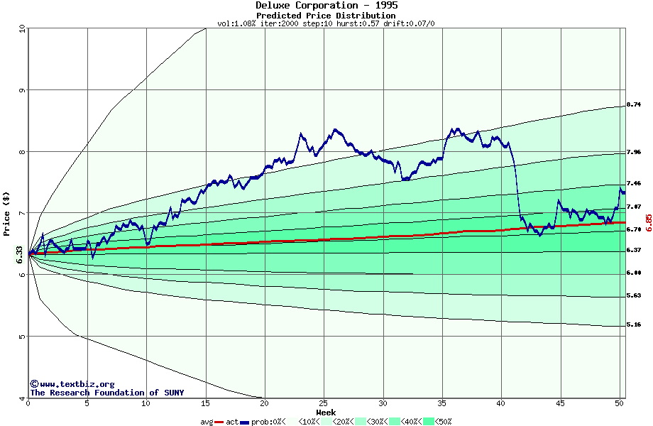 The following graph plots the year-to-date performance of the stock for 1995 compared to the probability calculated by a random walk model.