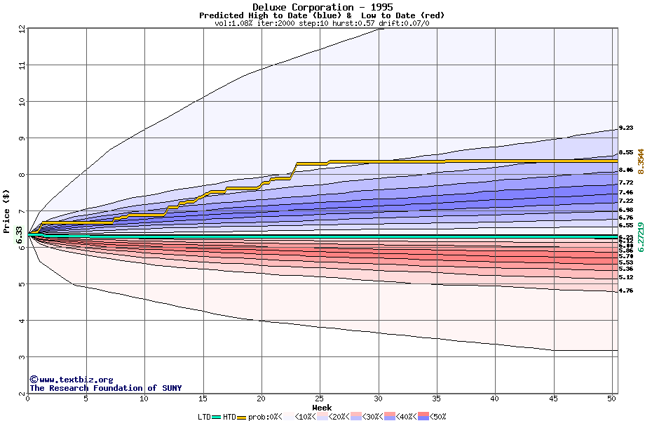 The high to date and low to date prices of the stock plotted against a random walk model for 1995 (what's this?).