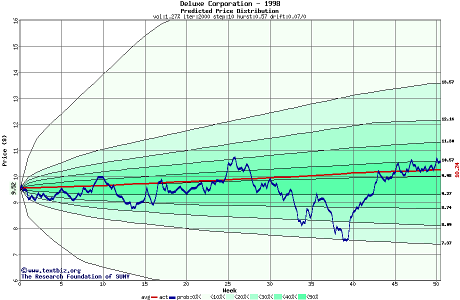 The following graph plots the year-to-date performance of the stock for 1998 compared to the probability calculated by a random walk model.