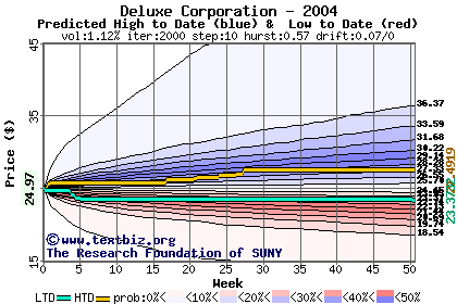 The high to date and low to date prices of the stock plotted against a random walk model for 2004 (what's this?).