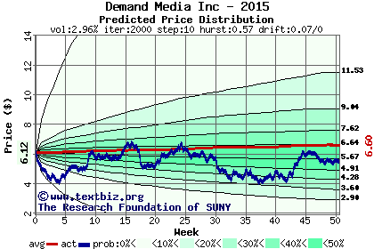 The high to date and low to date prices of the stock plotted against a random walk model for 2015 (what's this?).