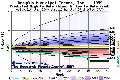 The high to date and low to date prices of the stock plotted against a random walk model for 1999 (what's this?).