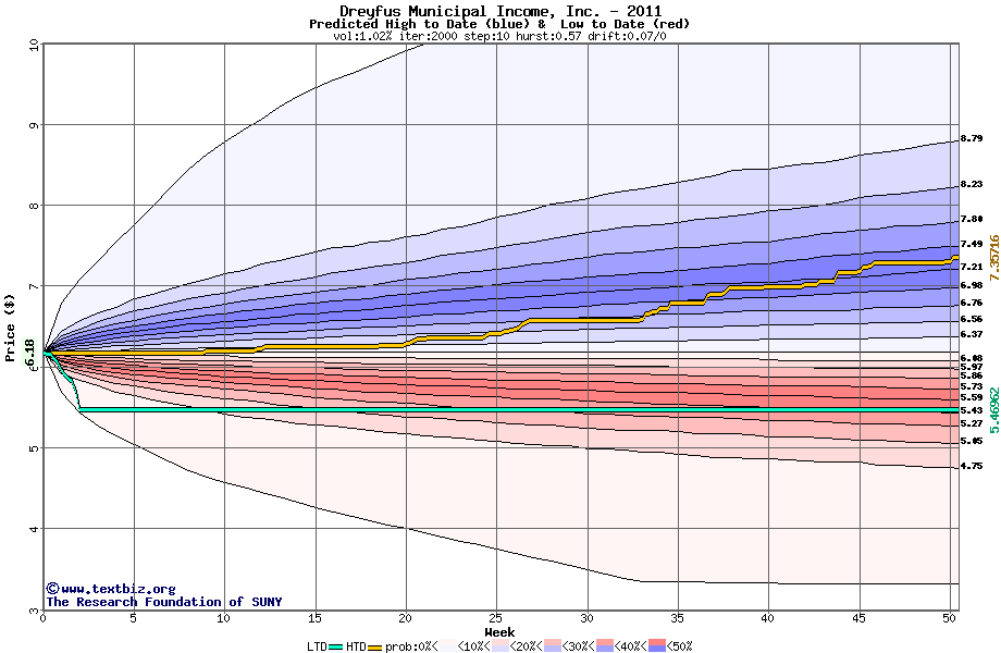 The high to date and low to date prices of the stock plotted against a random walk model for 2011 (what's this?).